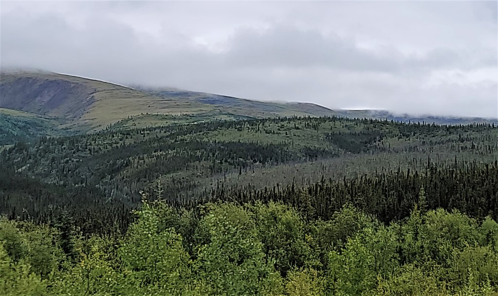 Now I see why they name this hwy as “Top of the World!” We’re so high up in the mountains that we can see all the lower mountains and valleys on both sides of the road. The valleys of spruce lined both sides the road and with a slight mist of rain, one can imagine the scent of fresh pines evaporating in the air. Somehow the song “Green Fields” or “The Green Leaves of Summer” comes to mind and I can hear the music and lyrics running through my mind like an old record back in the days….