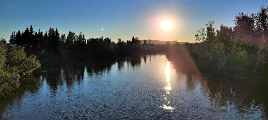 Looking at the aurora tracking website, there was a Kp factor of 4 for this evening. So after dinner, I nudged Paul to drive me to the Farmers Loop Rd as recommended by the Visitors Center to camp and catch the aurora show at 2 AM. The Farmers Loop does have less light pollution than in town, but there wasn’t any parking spot for BAT to camp and wait till 2AM. We found a church with a decent parking lot; we parked there while deciding what to do…. It just didn’t feel right parking at the church as though we were snooping around. I googled the aurora lodge, a summit popular for the aurora watching venue about 20 miles away. Now we’re debating whether to drive there or not as it is now 10:30 pm. We didn’t mind the drive but wasn’t sure if we’re allowed to park there since they’re not opened until late August. I checked the aurora website again, and it said “full moon” tonight. Darn it, there goes the plan! Well, I guess it wasn’t meant to be. As you can see, I’m obsessed with the northern light and it is on my bucket list. Others had to pay thousands of dollars to travel from afar to Fairbanks to catch the northern light, and here I am, in the middle of the aurora haven, but wrong time the of the year to see it. I’m literally just off by 2 weeks according to the varies aurora websites. Arrrrrghhhh! 🤕