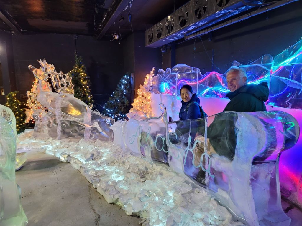 Today is museums day. We started off at the Ice Museum with a short video overview, explored the ice sculpture exhibitions, screamed all the way through the ice sled ride for the thrill, and watched a live ice carving demonstration. It was 25° F in the museum to keep the ice sculptures from melting. I had a winter coat on and winter gloves, but my ears and hands were so darn cold. Yet the locals said in the winter, it can get down to -50° F at times. Yikes! I love Alaska but I don’t think I can survive the winter here.