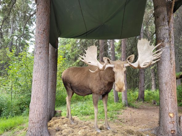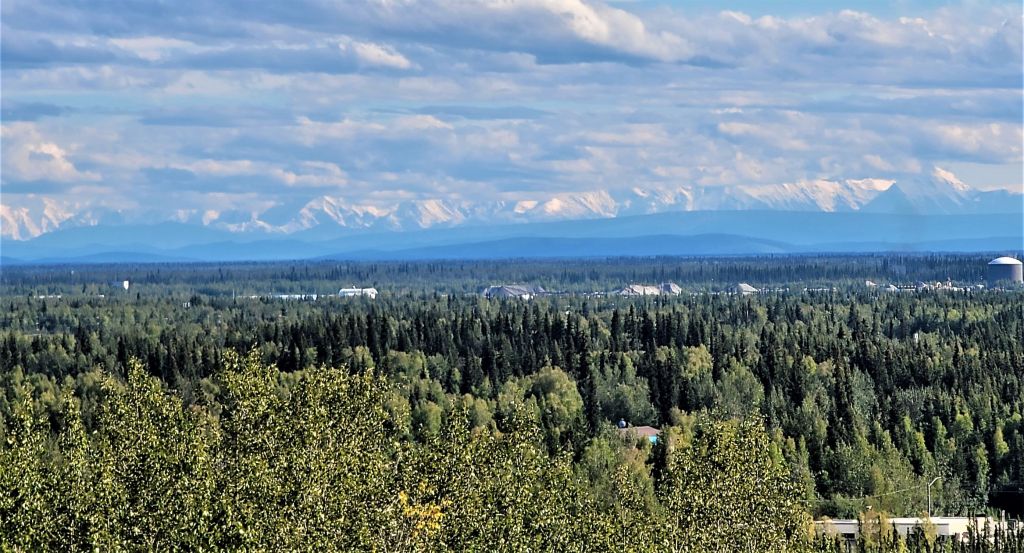 After a rainy day and cold night, one degree below freezing point, we are rewarded with a beautiful sunny day and an incredible view of snow covered mountains, the Alaska Range, in the back drop of the Tanana River & lined with rows of Spruce trees. Truly magnificent!