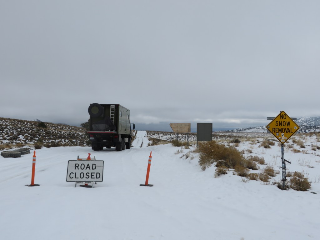 After a night at Eureka Dunes, I made my way back through the North Pass and onwards towards the springs in Saline Valley. Firstly however I had to traverse the snow in the pass. The road always shows closed, for legal reasons I believe, so the county is not obligated to come and rescue you. Having bypassed the sign I headed off into a winter wonderland.