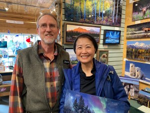 We went back to our base camp for a quick snack and headed downtown for more sightseeing. Our first stop was the Three Bears Gallery, and there we discovered an impressive artist, a painter and a photographer, Shane Lamb. His paintings of Denali were so realistic; we weren’t sure if they were painting or photograph at first glance. I was in awe with his aurora pictures printed on metal. They look surreal! I was having a really hard time deciding which one to get, then all of the sudden, this man came by with the name tag “Shane!” I was starstruck… and asked: “you’re Shane?” He smiled and nodded. I complimented him that all his pictures are so amazing, I can’t decide which one to buy. Then he explained one of them named “Heaven’s Romance” to me, and I was sold. I bought another one named “Reign of the Green Dragon.” I was so happy to have met the artist in person and had him explain these pictures to me, the inspiration and that magical moment of image captured.