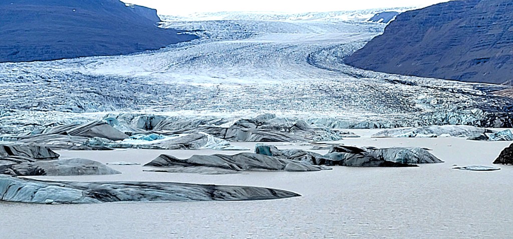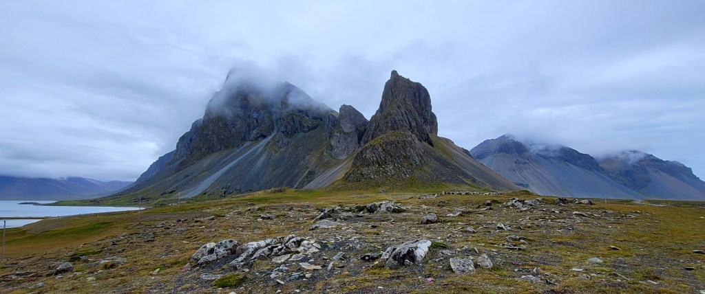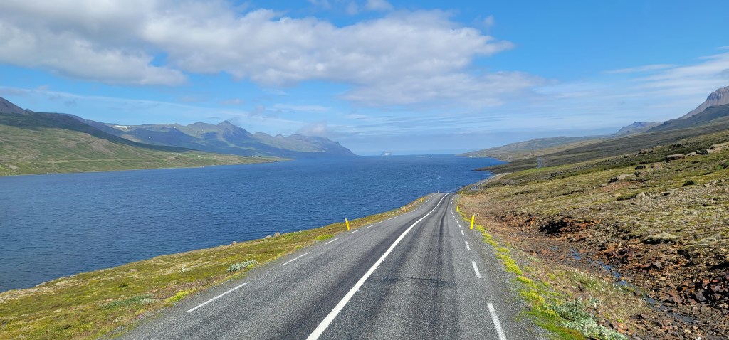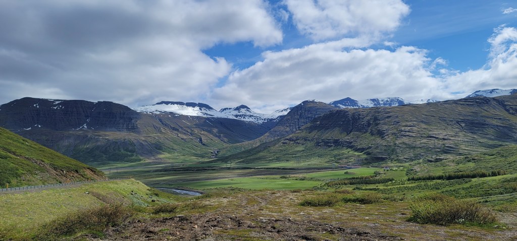 We have arrived in Iceland! As we left the ferry port in Seyðisfjörður, we were enveloped in snowcapped mountains, low clouds, fog, misty rain, frozen lakes, ice banks on the road, etc. Oh boy, what a “warm” welcome! Besides all that, the scenery is just breathtaking. I sat inside the cab with a coat on and a blanket covering my legs, and then I put my gloves on, and pulled out a second coat to keep warm since we couldn’t control the temperature inside the cab to stop the windshield from fogging up so Paul can drive in the fog with limited visibility.