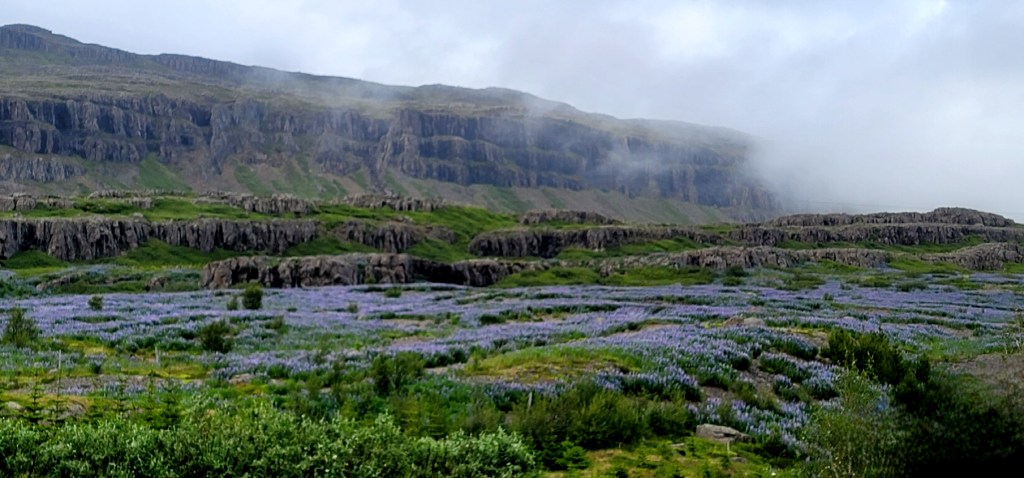 We’re heading south today, going on the Ring Road, quite a scenic drive from the mountain going down to the ocean with spectacular views in all directions. Lupin flowers are blooming everywhere. Some sections of this scenic drive are covered with the purple Lupins, other sections are covered with yellow Buttercups. What an amazing tapestry of colorful grounds against the snow, white mountains with low hovering clouds. The lyrics “the hills are alive with the sound of music” keep echoing in my mind… If you’re an artist looking for inspiration to paint, this is where you should go!