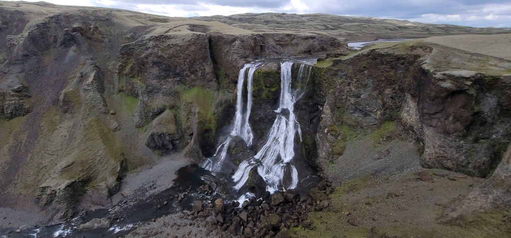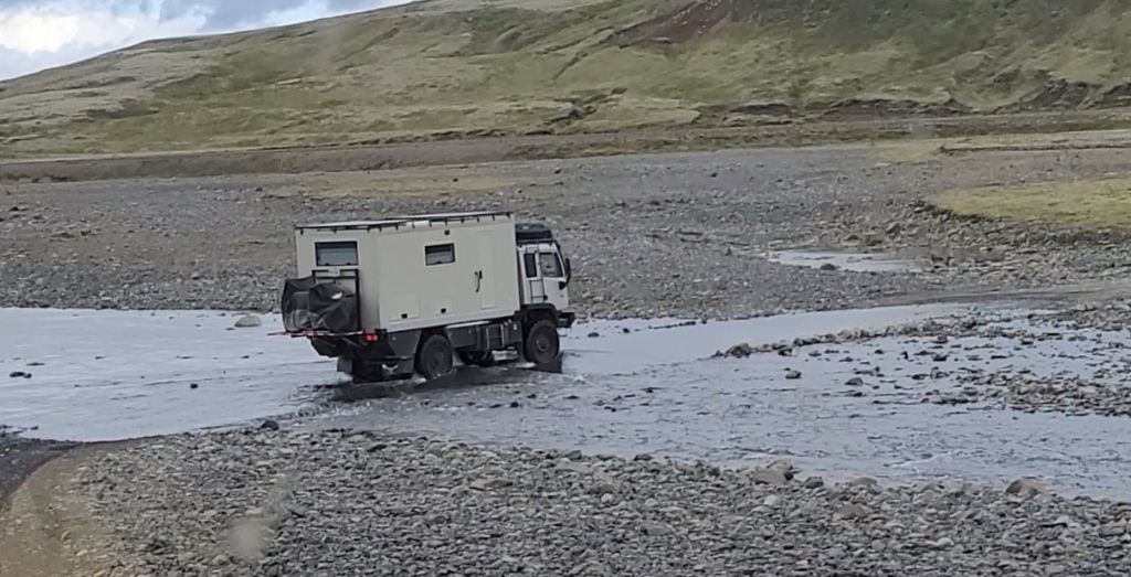 After catching up with Tiffany and Kurtis in Iceland we made plan for it, and here we are, at last, the magnificent Bláfjallafoss Fall and epic river crossing. The day started out warm, sunny and beautiful, but by the time we arrived at the Fall, heavy gusty wind picked up. Kurtis launched the drone, we did a couple of takes crossing the river, but the wind had gotten so strong, we decided to take a break, have lunch, and wait for the wind to die down. The wind was howling and rocking both of our trucks like a cradle. I checked the weather forecast which indicated that the wind won’t calm down until late evening. So disappointed that we didn’t get the drone shot we wanted, but Paul was determined to stay put until he can drone.