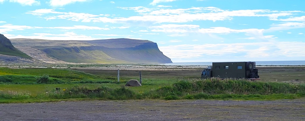 It was about 4:30pm, we need to start looking for a place to camp. Paul spotted a small road splitting off from the main road, so we went down that path to search for a wild camp site. Four miles down the dirt road, we found a service road that took us near the water and a potential camping spot for the night. After we parked, somehow I didn’t feel right about this spot, instinctively just felt really off. I can’t explain it, but felt really uneasy, so I asked Paul to find another camp site. It took a loooong time, but we finally found a spot from the iOverlander app. We finally arrived about 7pm and wild camped at a big bluff, overlooking an ocean bay in Flókalundur.