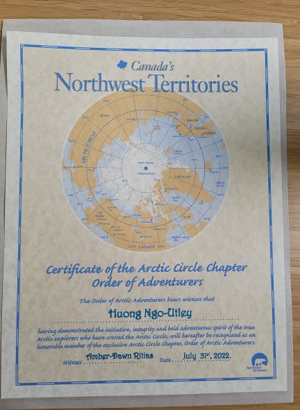 Maintenance day, groceries, etc. We went to the Visitor Center and received a certificate stating: “Certificate Arctic Circle chapter of Adventurers – The order of arctic Adventurers bears witness that Huong Ngo-Utley having demonstrated the initiative, integrity and bold adventurous spirit of the true Arctic explorers who have crossed the arctic Circle, will hereafter be recognized as an honorable member of the exclusive arctic Circle Chapter, Order of Arctic Adventurers.” Woohoo! We have proudly earned it!