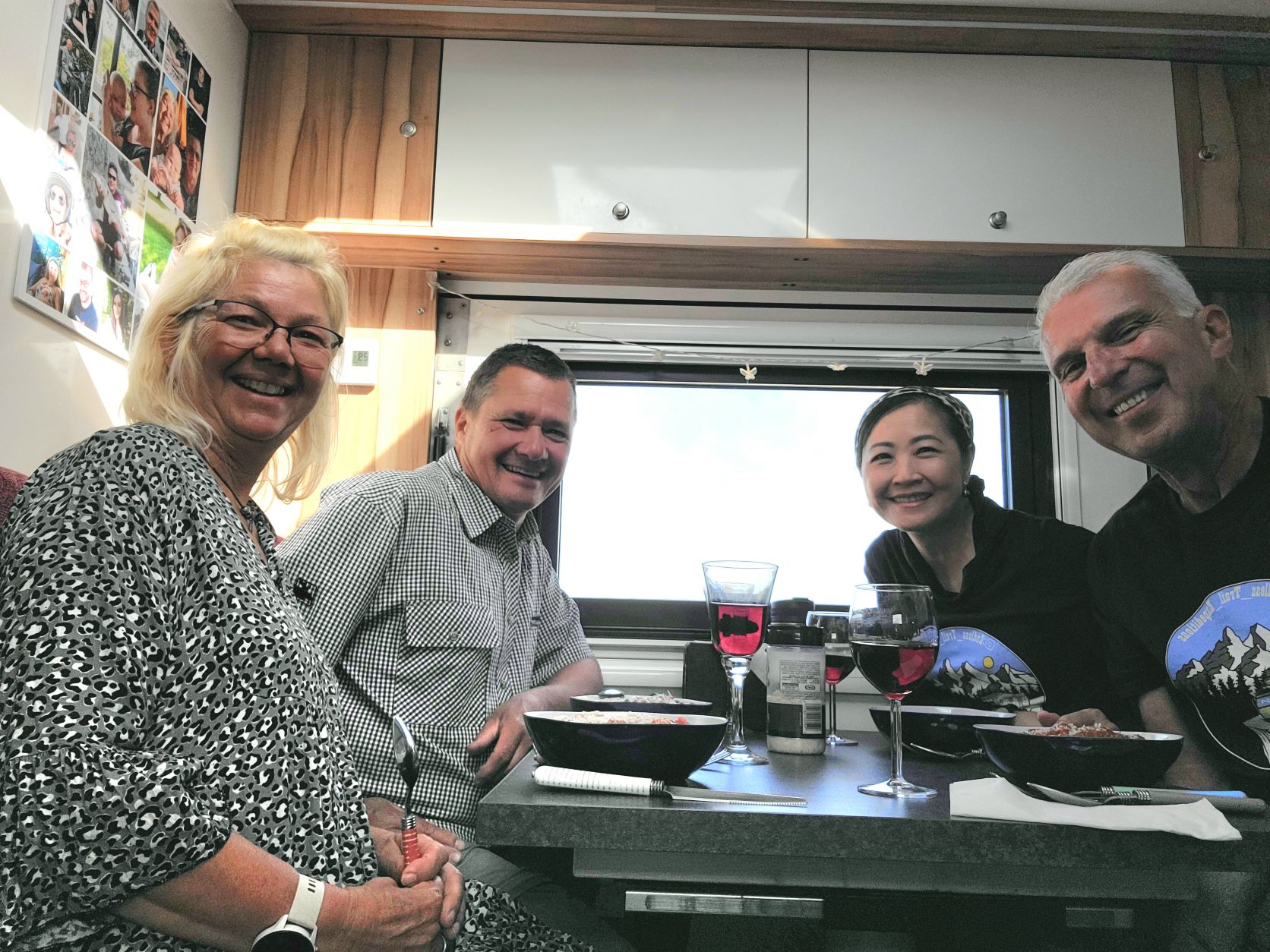 After all the tears of joy (not really) and all the pictures to document the achievement of making it here, they invited us over to their pad for dinner. We had spaghetti and 1.5 bottle of wine. Then we invited them back to our place for desserts, enjoying cherry jubilee with ice cream, and more wine. We had a lot of laughs chatting about our adventures and how Joe met Elfi. Quite a funny story.