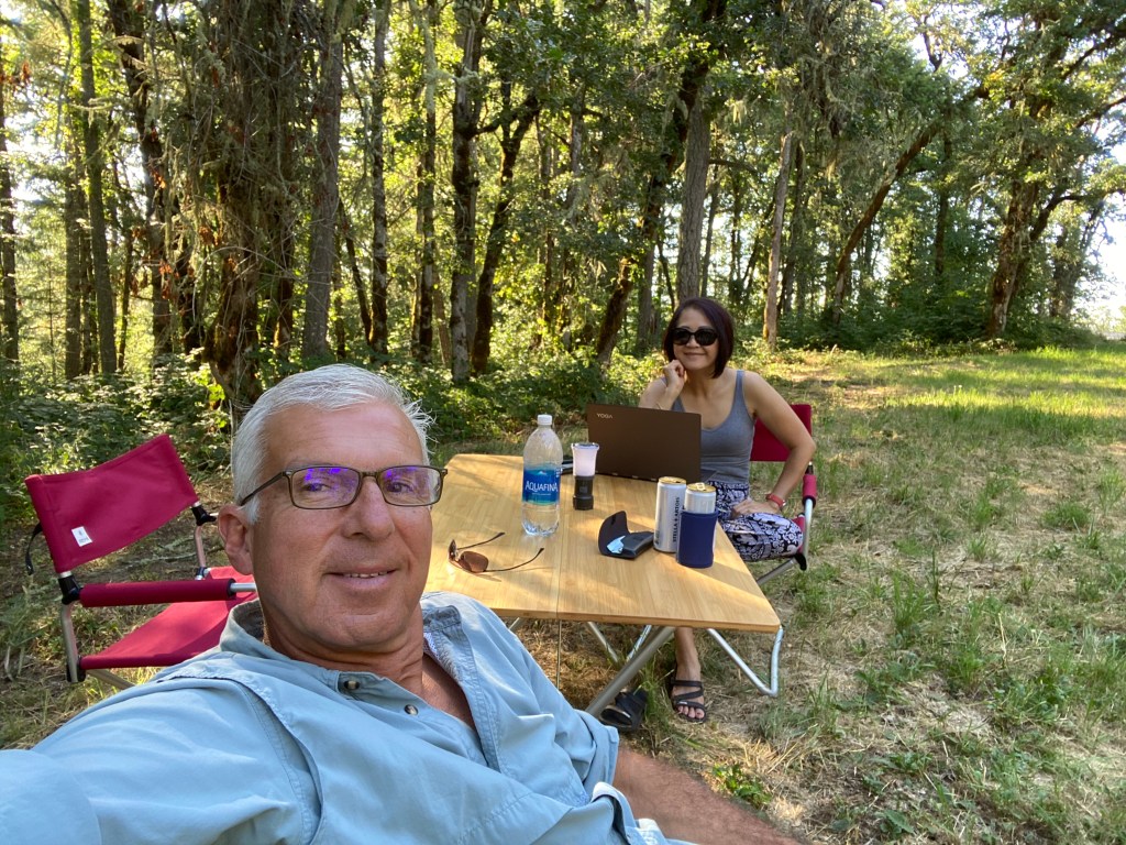 Parked at Walmart to do some shopping, and rest for the night. However, we were asked by Security to move out around 8:30 as the city is not allowing out of towner to stay here during covid-19. As we were just about to cook Paul asked the security guard if we could leave after dinner. The security guard was very pleasant and had no issue with Paul’s request. We had a quick bite and then scrambled to get on the road, and tried to camp at the Tumalo State Park, but they were fully booked, so we moved on to the next town, Redmond and camped at the national Walmart campground for the night. That was exhausting!