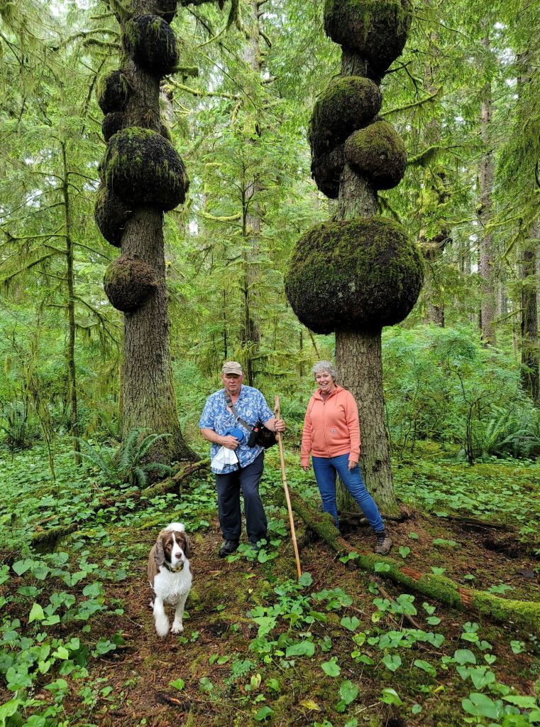 Lina showed me the salmon berries and huckleberry. I’ve heard of huckleberry before but have never seen one, and now I have. Charlie took us to a spot with trees having burls on them. They look like totem pole in a way, and Charlie explained how they developed. Things in nature that I’ve never heard of, and today I’ve learned a few more.