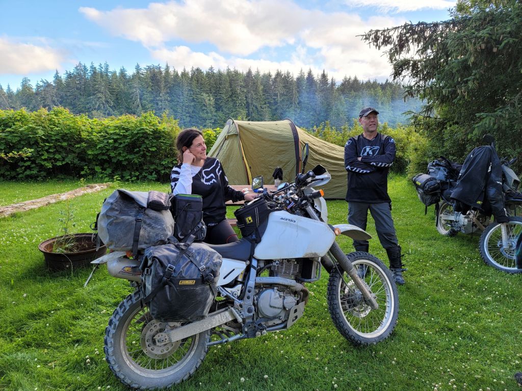 We arrived at the Cluxewe Resort in Port McNeil, a very big campground with cabins, and campsites for about 70+ RVs and tents. We got a beach front spot, yeah! After finishing all the chores, laundry, dinner, etc. we wandered outside for a walk to burn off a big meal with pies & ice cream for desserts. We met a very nice couple, Terry and Ray, with their very cool motorcycles and gears who camped nearby. They gave us lots of tips on what and where to go as we trek our way to Tuk. We’ve been so fortunate meeting these wonderful Canadians, so welcoming and helpful.