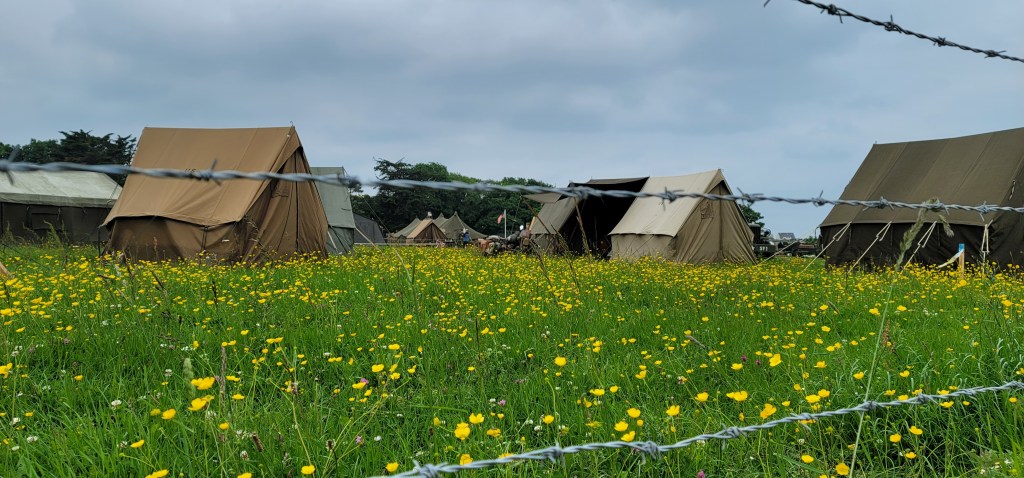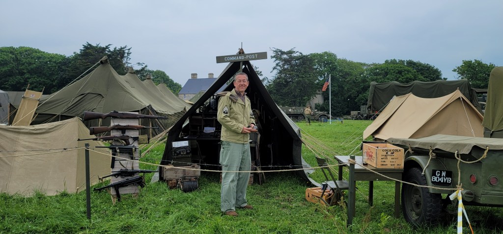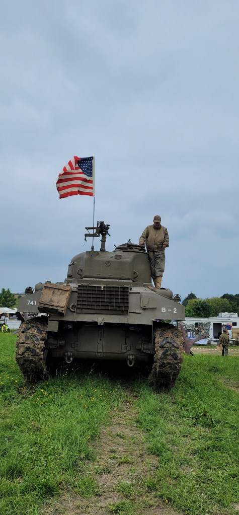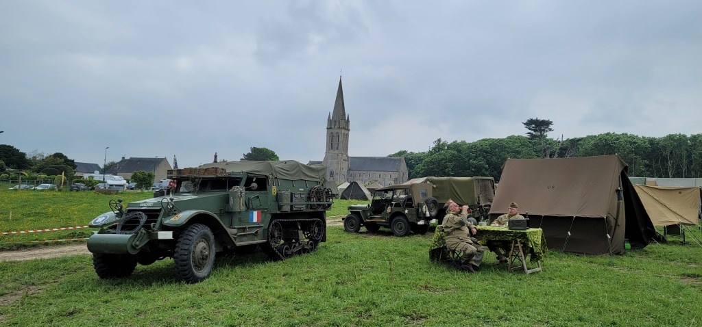 We took off to Omaha Beach in the morning. D-Day is on June 4th, 1944, today is June 1st, but we see allied flags, military tanks, jeeps, and trucks everywhere in preparation for the big anniversary day. Men and women dressed in WWII era military uniforms, walking the street, driving their military jeeps making these towns very festive. Visitors from all over the world gathered here making these towns super crowded. We are truly lucky and humble to be here on this 80th anniversary of D-Day and participate in these events.