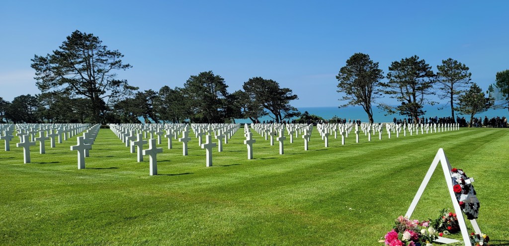 Our next stop is the American Cemetery in Colleville-sur-Mer, France. We arrived here in the late afternoon. This site is quite grand. As we approached the cemetery about 5pm, we can hear “Tap” being played, and the US flag being lowered in the center of the cemetery, I was tearing up seeing thousands of headstones in the shape of white crosses uniformly laid across the greenfield overlooking the Omaha beach. This is the price of liberation and freedom so that we can have what we have today.