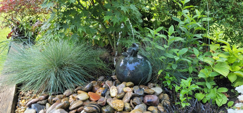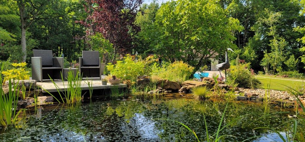 It turns out Lorraine is quite an abstract artist with some of her work featured in the Orleans Expo in France. She gave me a tour of the garden that she designed with a beautiful pond, variety of flowers, shrubs, trees that are harmonious and tranquil. I can sit here and “zen” out all day.