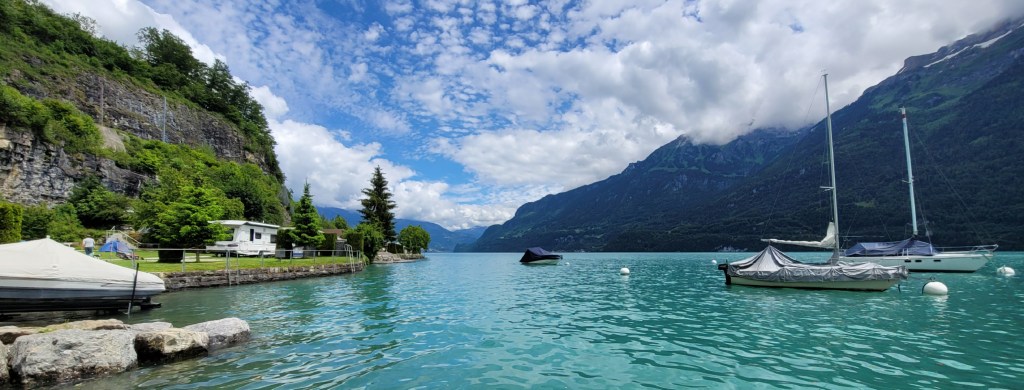 We were thinking of camping at another Aire on the way to the famous Lake Constance, but during our lunch break, Paul decided to camp at a lake near Interlaken, which was Camp Au Lac in Ringgenberg, Switzerland. Wow, it turns out to be a beautiful, scenic lakeside campground. Quite crowded, but so worth it. We paid $84 for two nights.