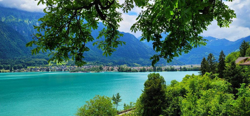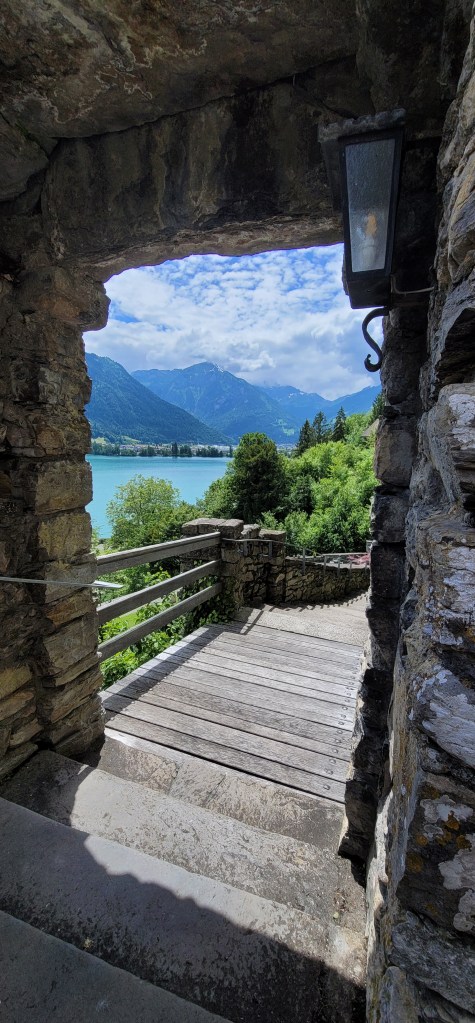 We took the bus to tour around Interlaken today. We were blessed with the perfect weather for touring on foot. Not knowing which station to get off, when the bus stopped at the first drop off point, which looks like Ringgenberg village center, we got off to look around. We stumbled across an old church high on a hilltop, so we hiked up there and was rewarded with a beautiful view of the lake and the town.