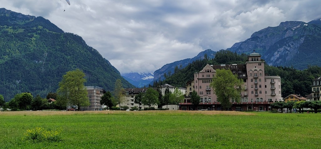 As we continued our walks, we discovered the high rent district with luxury shops. A beautiful central park adorn with snow top mountains in the backdrop, anchored by the 5 star Victoria-Jungfrau Grand Hotel & Spa that dominates this busy tourist area. Out of curiosity, I looked it up — a double-bed room, you’re looking at $1,200+ a night. What a steal, right?!!! I guess the Jungfrau view demands the high rent as “the Jungfrau, at 4,158 meters is one of the main summits of the Bernese Alps, located between the northern canton of Bern and the southern canton of Valais, halfway between Interlaken and Fiesch.” Ref Wikipedia