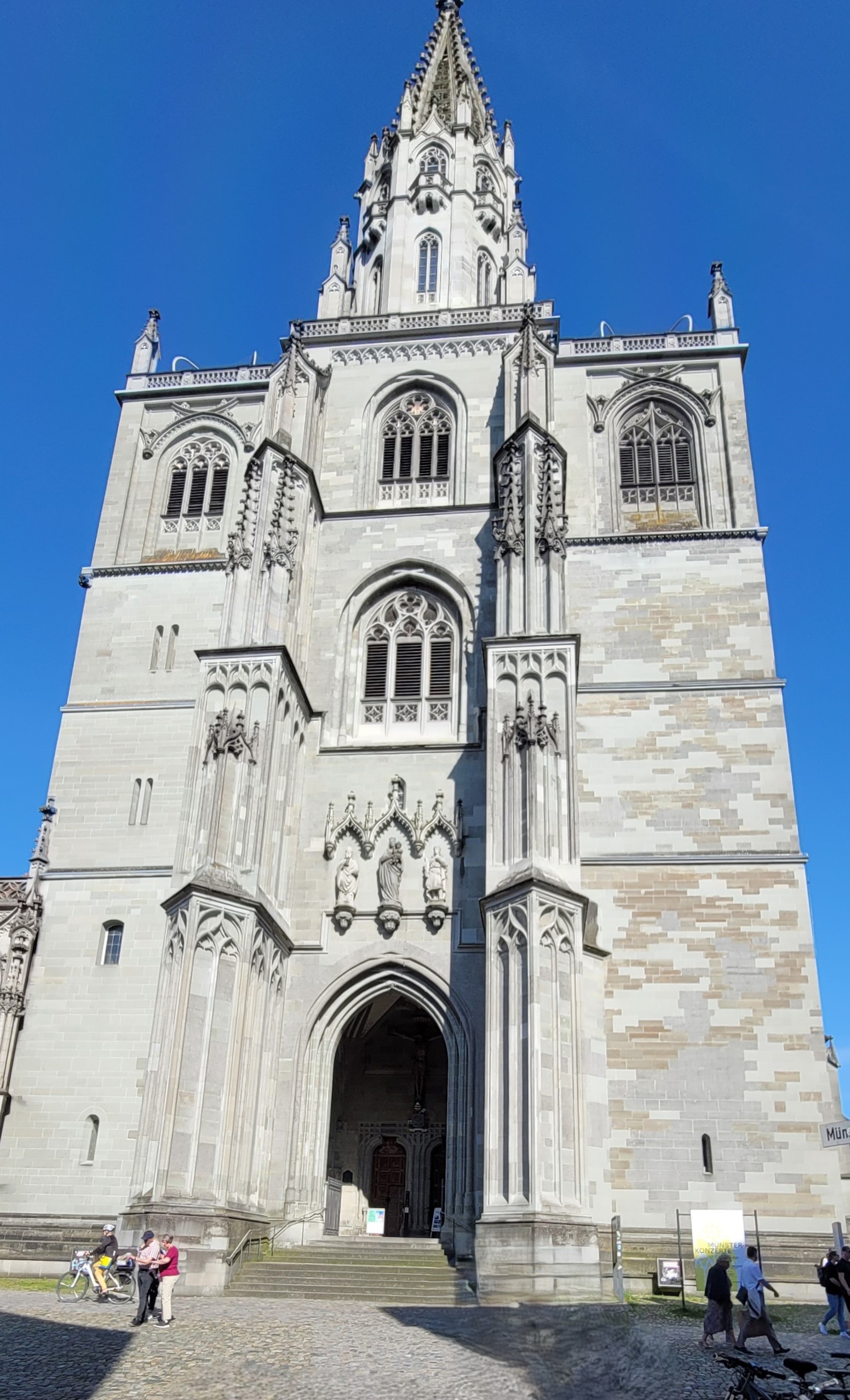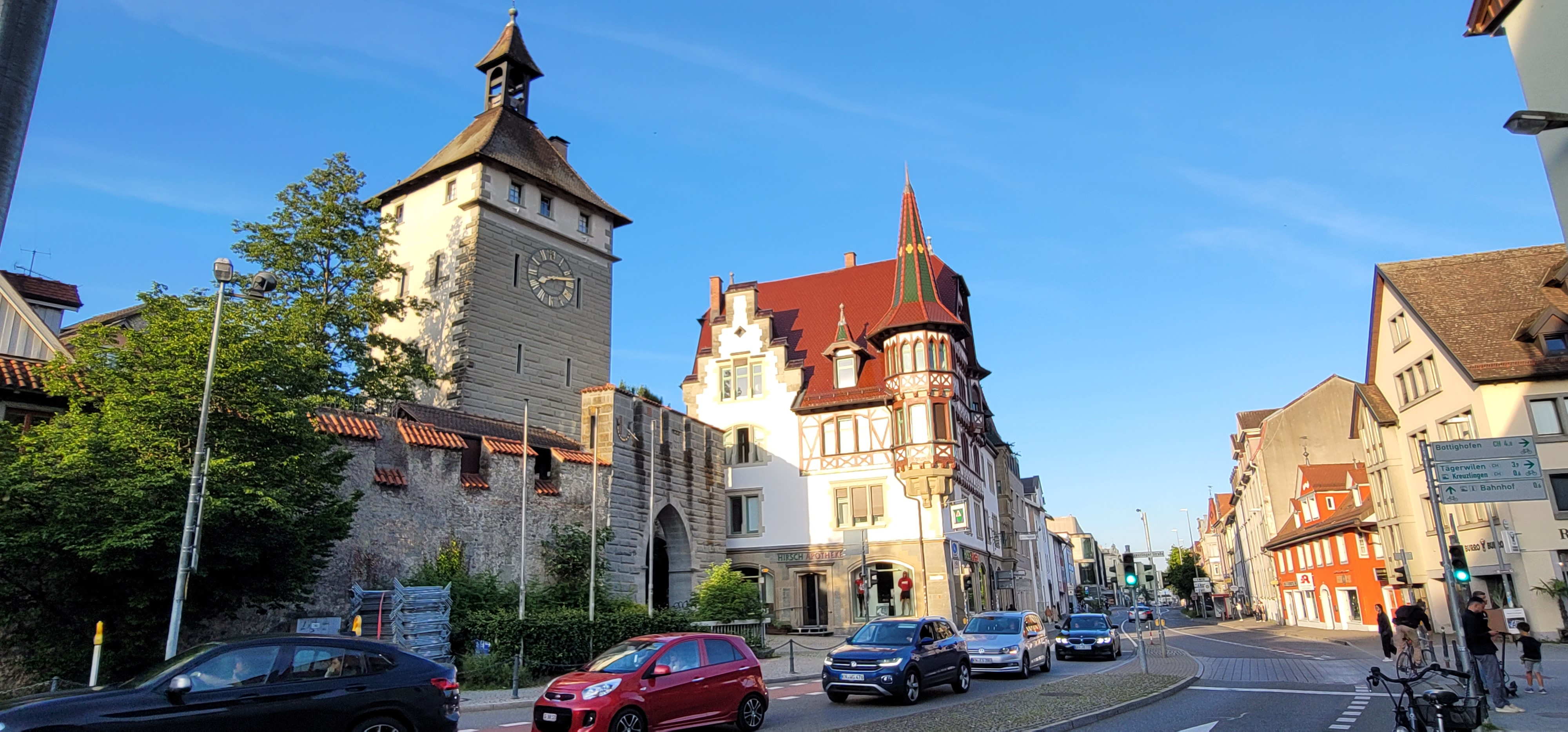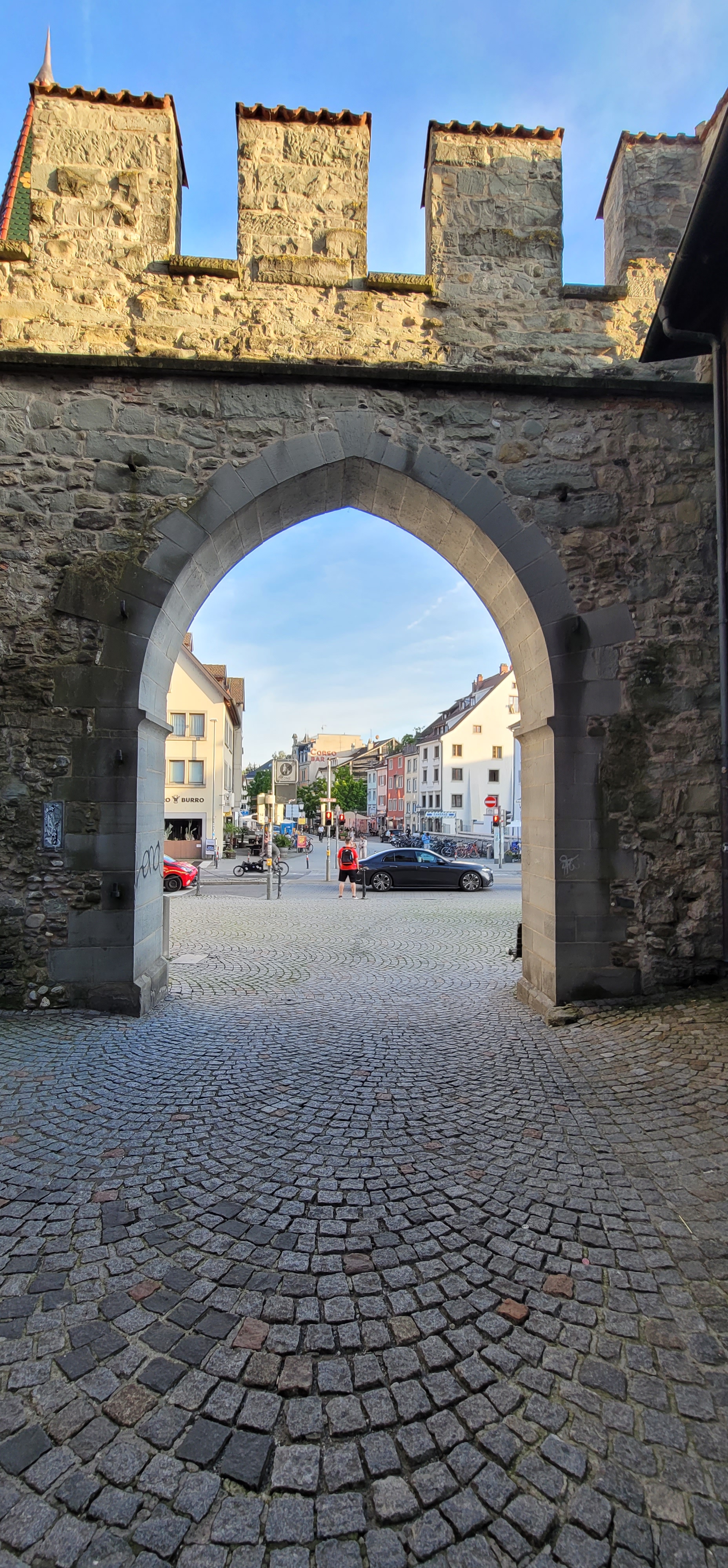 We camped in the center of Konstanz, a city on Lake Constance (Bodensee), in southern Germany. To make up for the dinner mishap yesterday, we googled and found a restaurant about half a mile away. Great, it’s within waking distance! And what a delightful discovery as we stumbled onto a preserved medieval district of Niederburg, which includes the Romanesque Konstanz Cathedral, known for its mix of decorative styles and a Gothic spire.