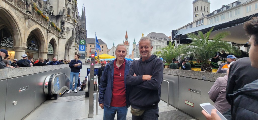 We got onto a bus to get to Marienplatz from our campsite, not exactly sure how to get there, but we thought we just hop on the bus and then figure it out. Paul was trying to figure out how to pay for the bus ride and the route to get to Marienplatz. An older gentlemen tried to explain it to us in English with a heavy German accent. It turns out he and his friend are also going to Marienplatz so he offered to guide us there. We got off the bus and went into the subway where he showed us how to purchase tickets for the subway train, about 17.5 Euro for two people. We arrived at Marienplatz and said good bye as we thanked the two gentlemen for helping us out.