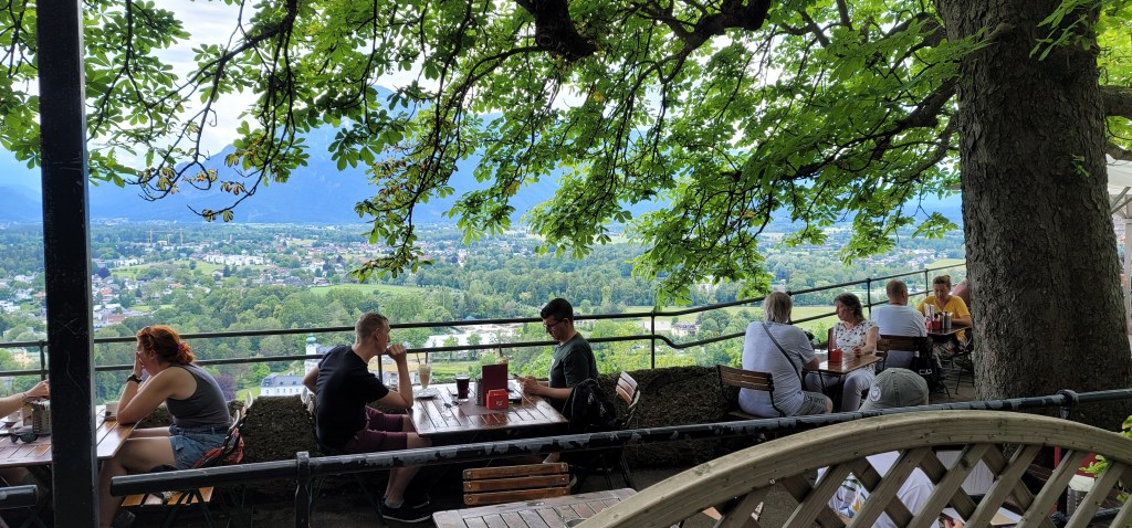 As we continue our stroll, we found the funicular station to get up to the Hohensalzburg Fortress. As soon as we got out, we saw a lovely restaurant at the top of the fortress. If we had known there was a restaurant up here, we would have had our lunch here since the view is truly breathtaking. 😏