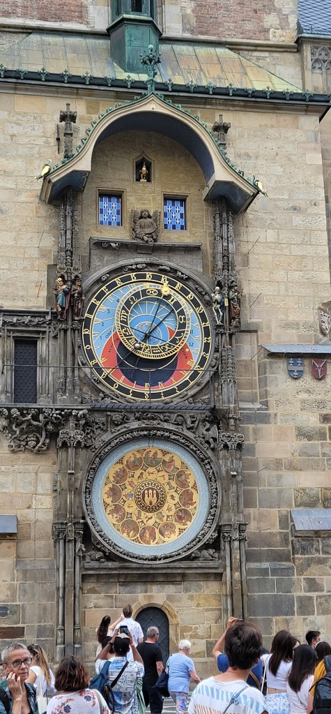 The Prague Astronomical Clock is the world’s most famous Medieval clock. It was built in 1410. The top part of the clock is what is called the Astronomical Dial. It represents the Universe or at least the maker’s perception of it when it was built during the Middle Ages. The dial includes a Zodiacal ring that shows the location of the Sun and the two clock hands are designed with a Sun and a Moon each.