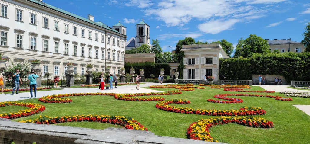 It’s exploration day in Salzburg. Our camp host gave us a city map and recommended a few highlights to check out. We took the bus and got off at the Mirabelplatz Garden, a beautiful spot to start the tour.