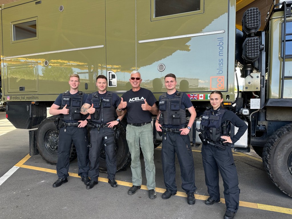 We arrived at the border of Switzerland & Germany this afternoon. The border officers asked us to pull over for inspection. Paul opened up the living unit and all four of them wanted to check it out, it was more of a tour than an inspection. They were very friendly (and so good looking…)😁